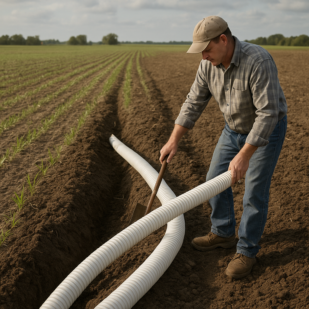 Consider tile diameter: typical installations use 4–6 inch pipes. Larger tiles handle greater volumes but require deeper trenches and more powerful excavation equipment.